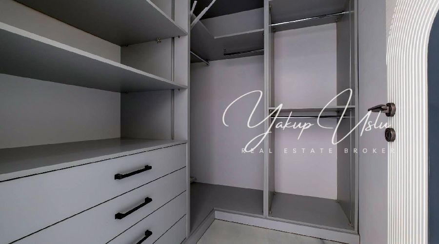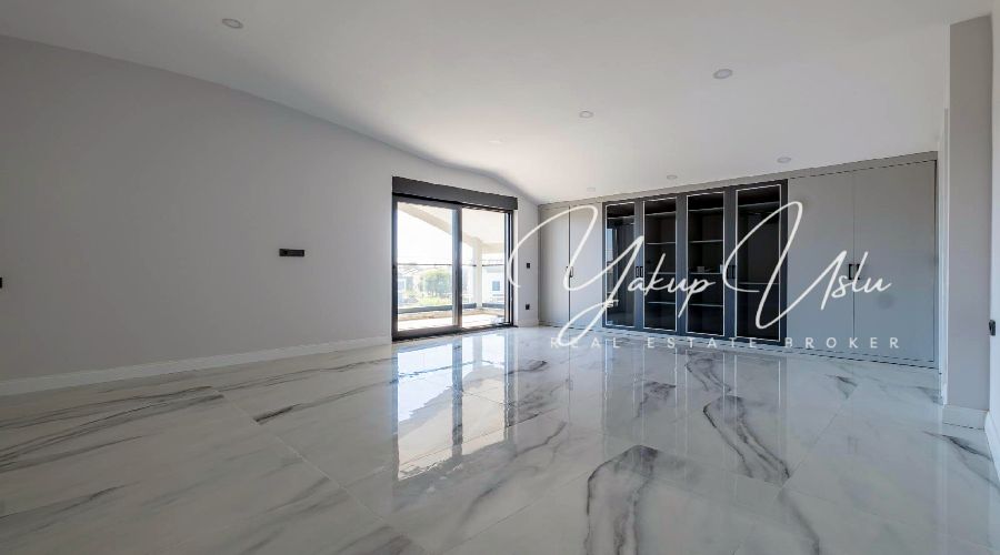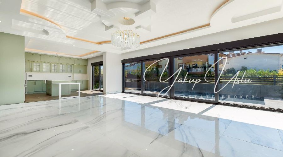 The villa features an American-style open kitchen that connects beautifully with the spacious living room, offering breathtaking views of your private pool and garden. Large windows flood the interior with natural light, creating a warm and welcoming atmosphere throughout this exceptional home in Side.